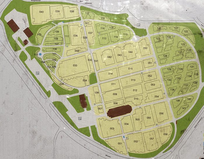 Kirkebygningen har adresse Økriveien 5. (Gårdsnr. 92, Bruksnr. 5)