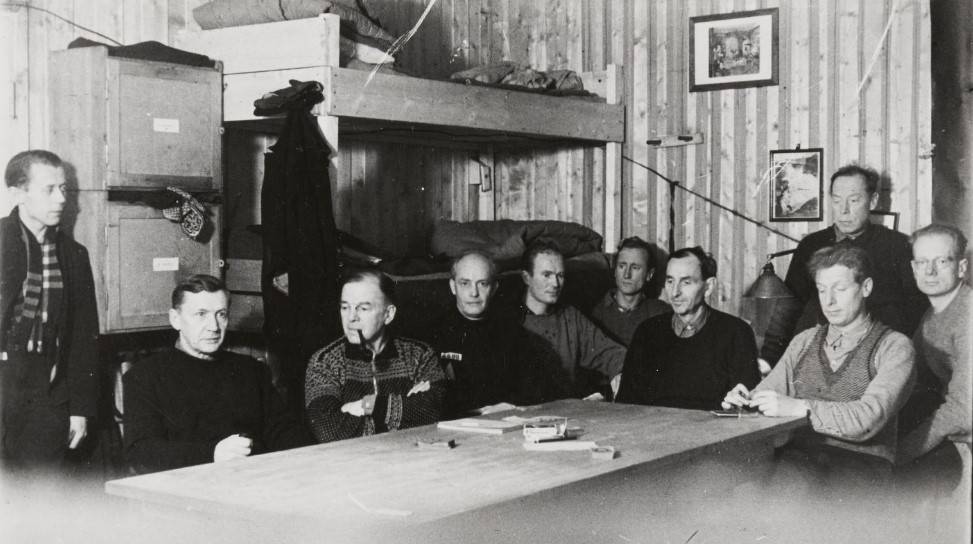 I fritiden om kveldene ble det som regel til at man satt "hjemme" og hygget seg med for eksempel foredrag eller forbudte kortspill. Bildet viser flere kjente personer fra den siste vinteren på Grini. Blant andre er han som sitter helt til venstre direktør Eugen Westblad, forhenværende riksmeklingsmann. Stående i bakgrunnen ser vi fylkesmann Gabrielsen. Kilde: Nasjonalbiblioteket