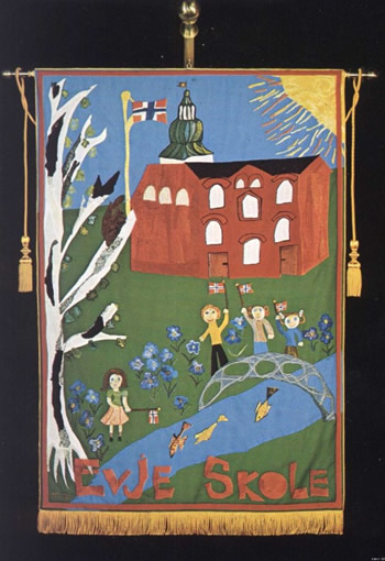 Hanen som prydet mange av de eldste lesebøkene, et symbol på flid og innsats, pyntet taket på Heldagsskolen. Denne bygningen ble revet i 2007.