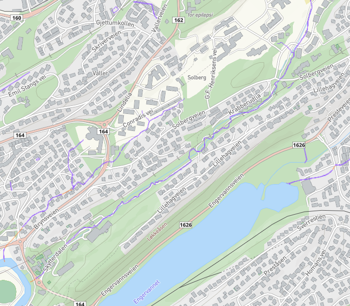 Det rant tidligere en bekk, Solbergbekken, gjennom dalen. Denne ble senere lagt i rør.
