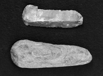Det er funnet en steinøks, en meisel av sandstein og flekkeskraper av flint på gården.