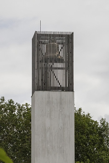 Muren, klokketårnet og minnesmerkene er alle støpt med trespiler som forskaling for å skape en helhet. Betongens ulike farger er valgt for å skape kontraster, med hvitt på klokketårnet, svart til minnesmerkene og grått til muren.