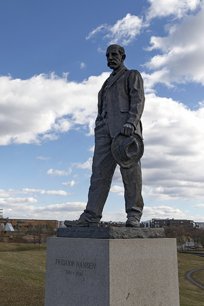 I 2011 ble det avduket en bronsestatue av Fridtjof Nansen på en kunstig oppbygget kolle, i anledning 150-årsjubileet for hans fødsel. Statuen, som viser Nansen i helfigur, er laget av billedhuggeren Per Ung (1933–2013).