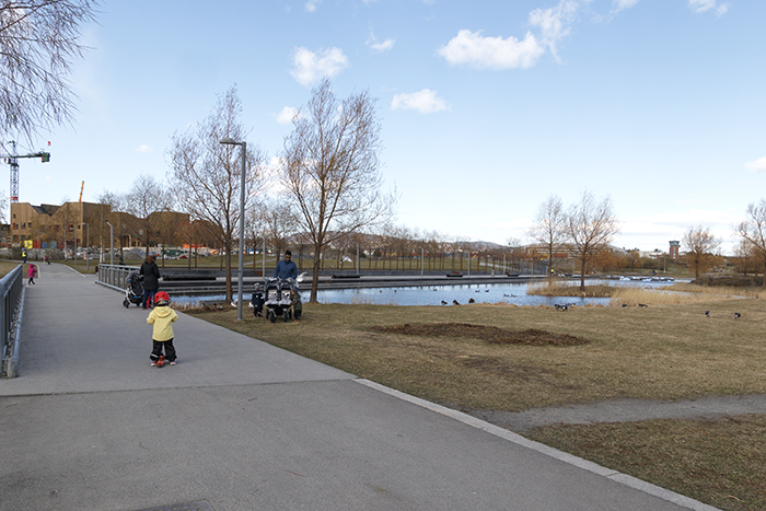 Midt i parken ble det anlagt en stor dam. Parken skal ta imot alt overflatevannet som kommer fra boligområdene rundt den. Vannet ledes i kanaler på overflaten til den sentrale dammen, og det renses gjennom biofiltre.