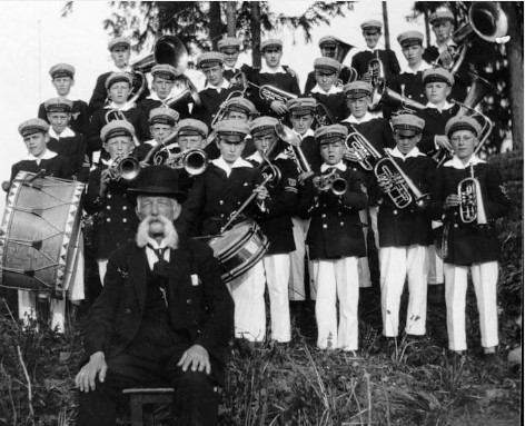 Grav skoles guttemusikkorps med sin første dirigent, fanejunker Håkon Larsen. Bildet er fra 1920-tallet.