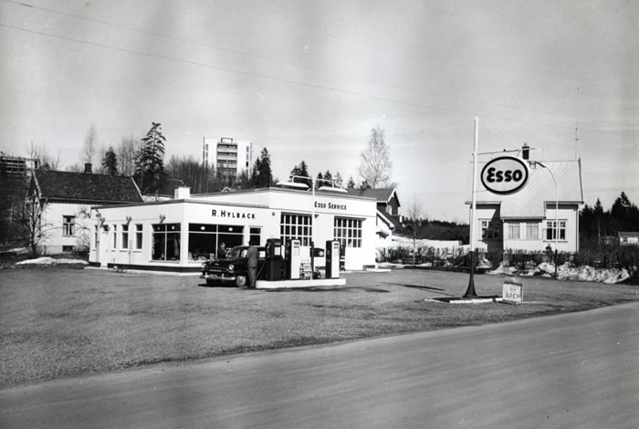 Norske Esso startet bensinstasjonen her i 1957. Dette var en moderne bensinstasjon på den tiden, med smøre- og vaskehall, batteriservicerom, dekkskift og slangelappstasjon. Her fikk bilistene god service og kunne kjøpe det de trengte til bilen.