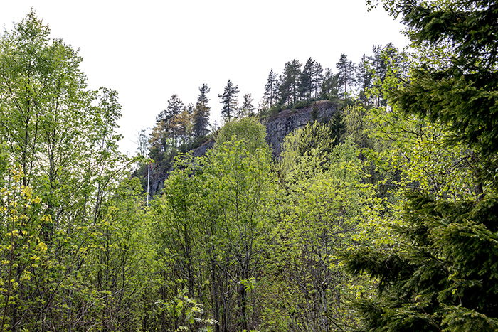 Rester av steinmur på nordvestsiden av toppen 2018. Dette er den eneste siden av toppen det ikke er stupbratt, og det var her angrep kunne komme. Slike murer kan ha vært fundament for palisader (spisse utstående trestokker). Foto: Knut Erik Skarning