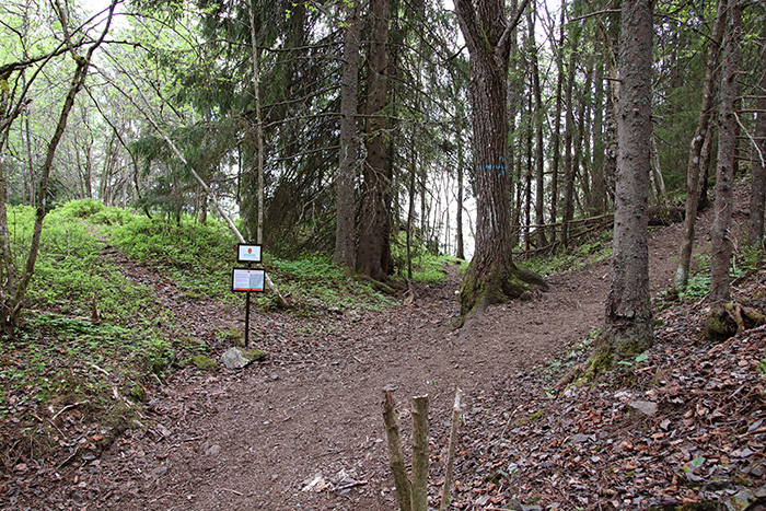 Stidelet ved informasjonsskiltet. Her tar man til venstre mot toppen.