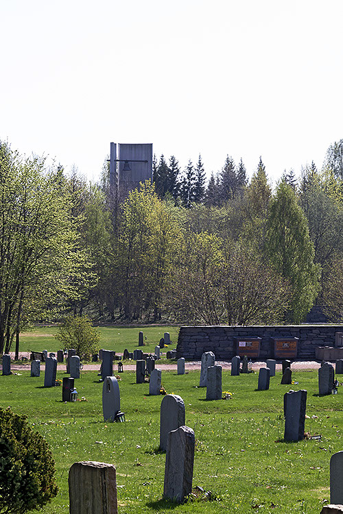 Til venstre ser vi klokketårnet og en av steinmurene som er karakteristiske for gravlunden.