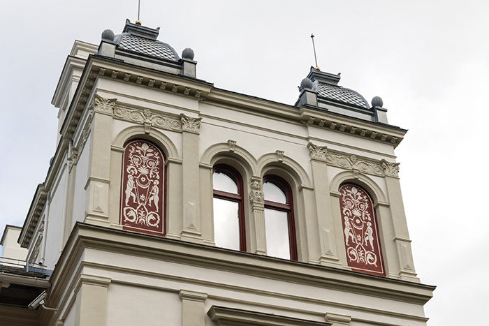 Utvendig på tårnet er det veggmotiver som viser glassblåsere i arbeid. Inne i Røkeværelset henger spesialbestilte malerier fra forskjellige glassverk.