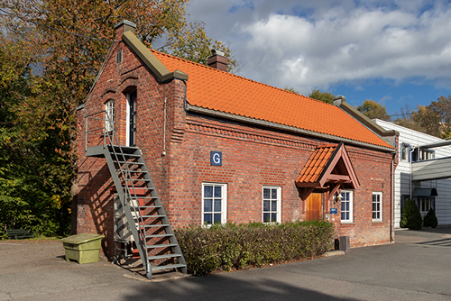 Huset til høyre er fra 1862 og er det eldste huset som står igjen på fabrikkområdet. Sett fra vest. I huset var det verksted og smie. Huset ble også kalt grisehuset fordi det var griser her under andre verdenskrig (1940−1945). Se også det nederste kartet og bildene nedenfor. Bildet er tatt i 2018. Foto: Knut Erik Skarning