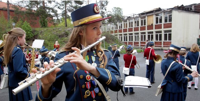 17. mai på Lysaker skole 2010, få dager etter brannen i nybygget. Lysaker skoles musikkorps spiller. Kilde: Lokalhistoriewiki