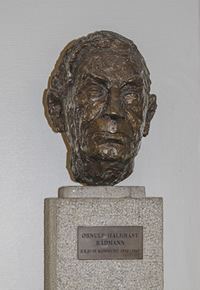 Bysten av rådmann Halmrast står inne i Rådhuset, og er ikke tilgjengelig for allmenheten.