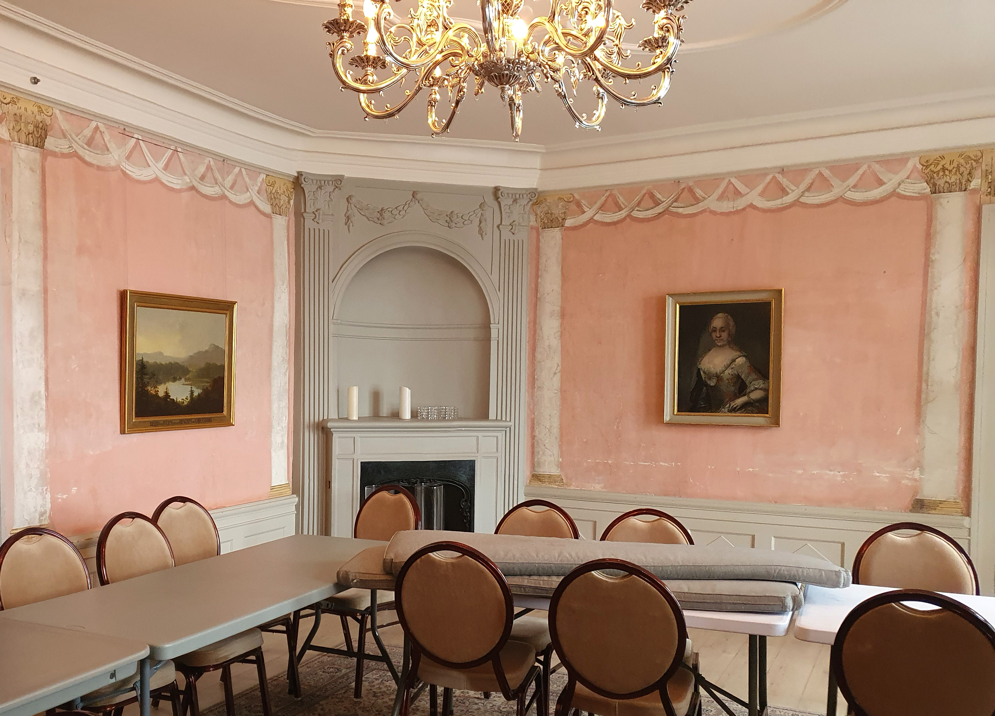 Her er en av salene, der man har fjernet gammel maling, og vi ser den opprinnelige fargen. Øverst på veggene er fine border kommet frem. Foto: Knut Erik Skarning