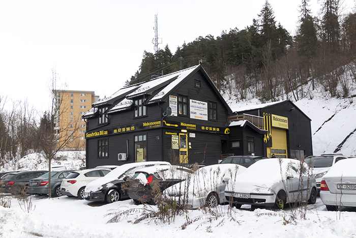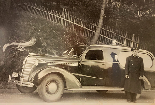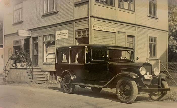 I Leif Larsens vei 9 drev Bjarne Halvorsen Sandvika begravelsesbyrå fra 1924 til 1983. På bildene ser vi to av bilene han benyttet, to Chevroleter. I huset bodde også Bjarne Halvorsen og familien hans.