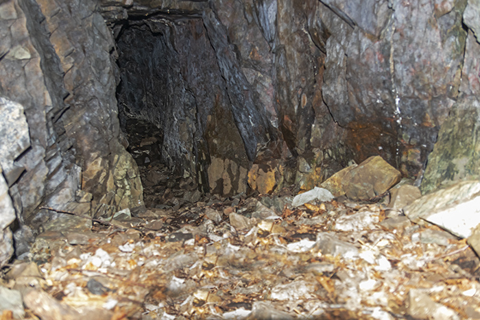 Inne i gruven ser det slik ut. Det går en gang videre innover til venstre.