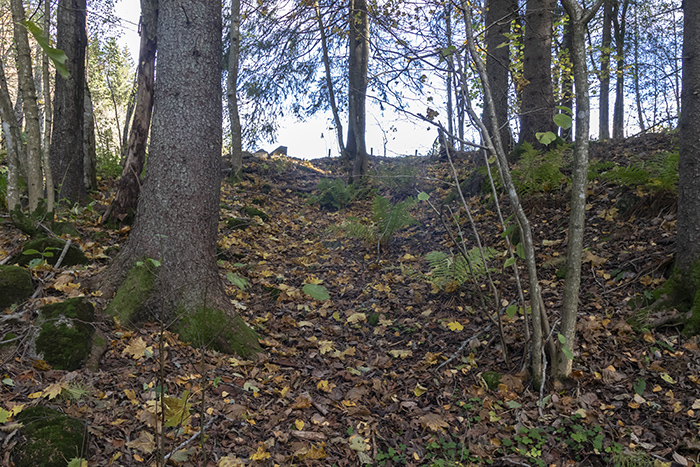 Den øverste, nordligste, hulveien vi ser på detaljkartet er lettest å finne. Området er gjengrodd.