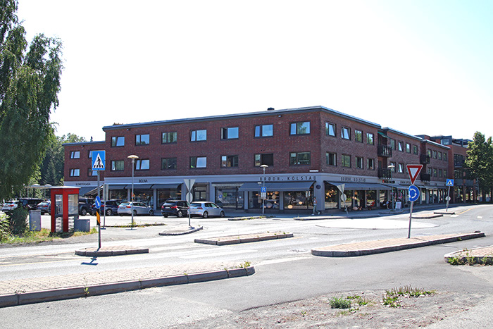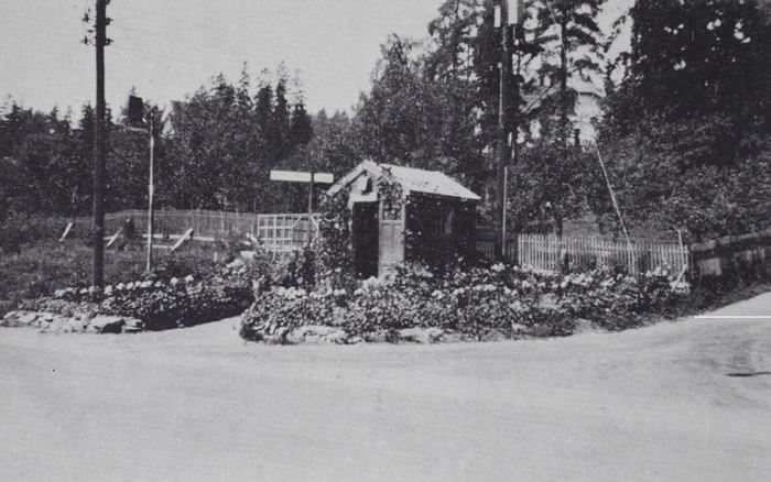 På hjørnet Gamle Drammensvei – Åsveien sto drosjebua. Den ble revet i 1972/1973 for å gi plass til ny bebyggelse.