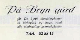 "Historien til gartneriet startet i 1936. Ragnhild Holmen på Bryn, som var utdannet gartner, begynte å dyrke blomster for salg. Mange kunder ønsket å kjøpe blomster for å plante på kirkegården som ligger rett ved, og i hagene sine. I starten foregikk produksjonen helt annerledes enn moderne dyrking i drivhus i dag. Ved hjelp av hestemøkk og halm som gjæret, fikk man varm jord. Denne blandingen ble fylt i trekarmer, og da kunne gartneren så tidlig om våren. Ble det kaldt om natten, la man vindusruter over. Dette var forløperen til dagens drivhus.