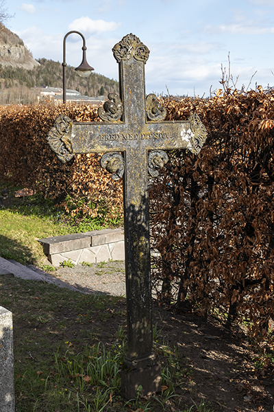 Korset har palmetter i armendene og englehoder i krysset. Nederst er det senket fakkel med gren. Korset er støpt på