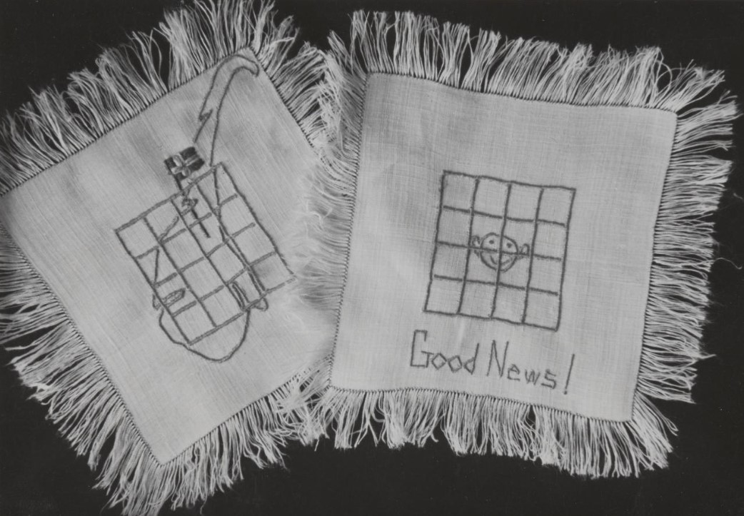 Lommetørklær, sommerkjoler og halstørklær ble klippet opp og gjort om til presanger og Grini-minner. Som oftest ble tingene gjemt i madrassen, inntil det ble mulig å få smuglet dem ut av leiren. Kilde: Nasjonalbiblioteket
