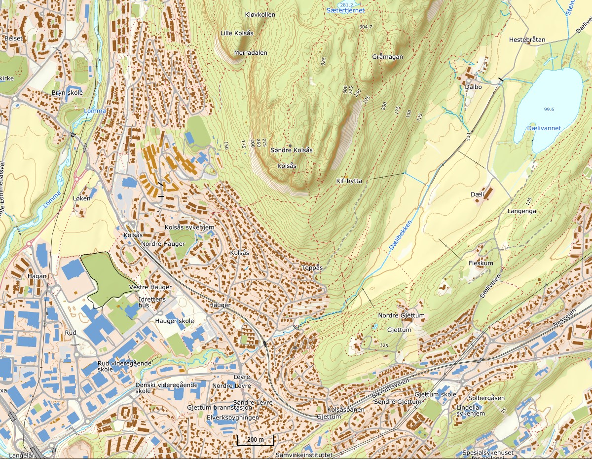 "I 1973 ville Bærum kommune lukke den nedre delen av Dælibekken for å bygge verksted og lagerbygg for tekniske etater på Rud-Hauger området. Det kom mange protester fra Gjettum Velforening, Bærum Miljøvern, Bærum Sportsfiskere, Bærum Jeger- og fiskeforening og
