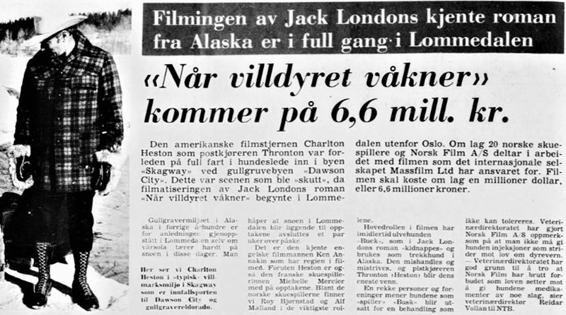 Charlton Heston hadde hovedrollen. men også lokale statister og hundekjørere fra distriktet deltok. Hundekjørerne måtte dope hundene når de skulle spille døde i filmen. Dette skapte kritikk fra dyrevernshold og førte til oppslag i avisen Verdens Gang og forbud fra veterinærmyndighetene. "Ring kongen og avtal et møte" utbrøt Heston, som ikke var kommet helt fra Hollywood for å la seg stoppe av lokale veterinærer. Men forbudet ble opprettholdt under hele innspillingen.