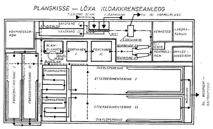 Første hovedplan for avløp ble vedtatt i 1965. Den innebar at avløpsvann fra Bærum skulle føres til to sentrale kloakkrenseanlegg, og det skulle benyttes separate ledninger for spillvann. I 1966 ble arbeidet med avskjærende kloakkledninger langs elvene igangsatt. I perioden 1966−1973 ble det bygget 10 midlertidige avløpsrenseanlegg, med stor grad av rensing med kjemisk felling. Disse lå i Sandvika, på Løxa (som er omtalt på denne siden) og på Fornebu.