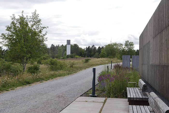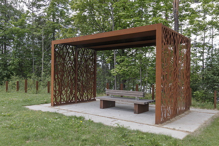 På området finner vi benker, klokketårn og kontemplasjonsrom (en benk omgitt av rustne jernkonstruksjoner).