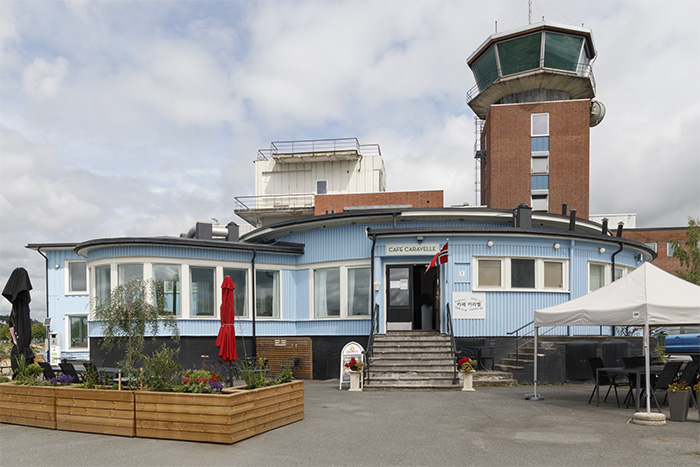 Odonata Café Galleri Catering ble etablert i den gamle runde bygningen ved kontrolltårnet i 2006. Bygningen sto ferdig i 1939. Se også De første bygningene ved flyplassen. Gamle Fornebu