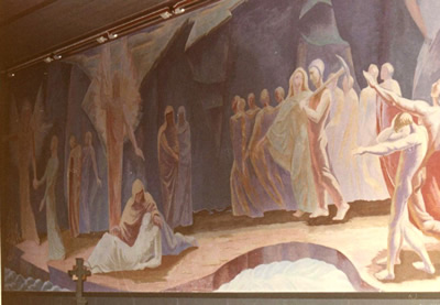 I forbindelse med restaureringsarbeidet i 1924–1927 fikk kirken blant annet nytt alter og orgel, og plankegulvet ble skiftet ut med tegl. I tillegg ble benkene fornyet, og korhimlingen ble dekorert av Axel Revold, med Kristi himmelfart som motiv. Takmaleriet, med basunengler i skyene over orgelgalleriet, er eldre. Denne restaureringen, som var igangsatt av Per Øverland, skulle delvis bøte på skadene fra 1853, kirken skulle få tilbake stilen fra renessansen.
