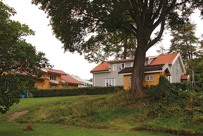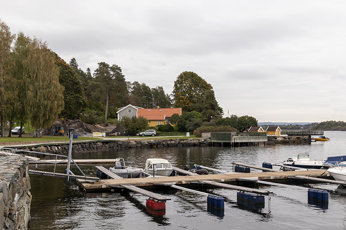 Det grå huset til venstre var den første skolebygningen på Høvik Verk. Det gule huset midt i bildet var Kontorsjefboligen for Høvik Verk. Til høyre ser vi Dampskipsbrygga, sjøbodene og mastefortøyningene. Bildet er tatt i 2019. Foto: Knut Erik Skarning