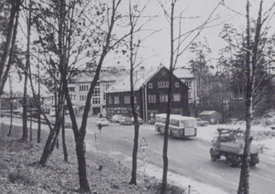 Høvik senter 1966. Sett fra nord. O. H. Bang-gården kan vi ikke se. Den ligger bak Jacobsengården midt i bildet. Vi ser ellers Jernbanegården til høyre og Hübertgården til venstre. Kilde: Bærum bibliotek