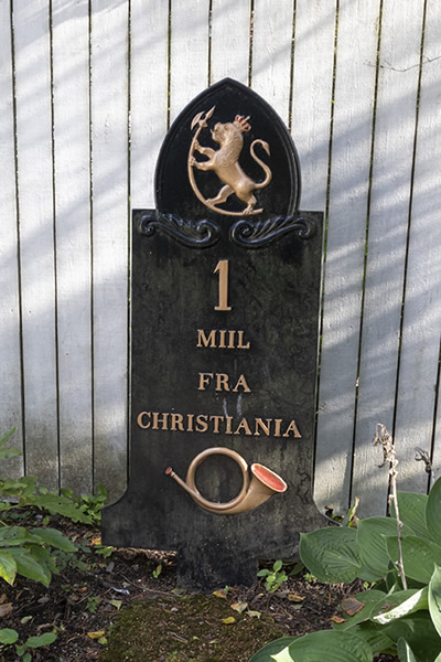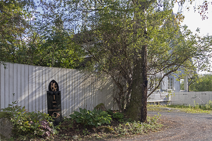 Milestenplassen lå en gammel landmil fra Stortorvet i Kristiania. En landmil var ca. 11,295 km. Den gamle milestenen står fortsatt. Den er flyttet inn fra veikanten og står innenfor porten.