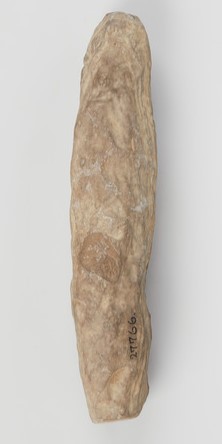 eldre steinalder (ca. 10000 fvt.–ca. 4000 fvt.). Forvitringen gjør at en ikke kan se spor hverken etter sliping eller prikkhogging. Lengden er 16,3 cm og største tykkelse er 3,4 cm.
