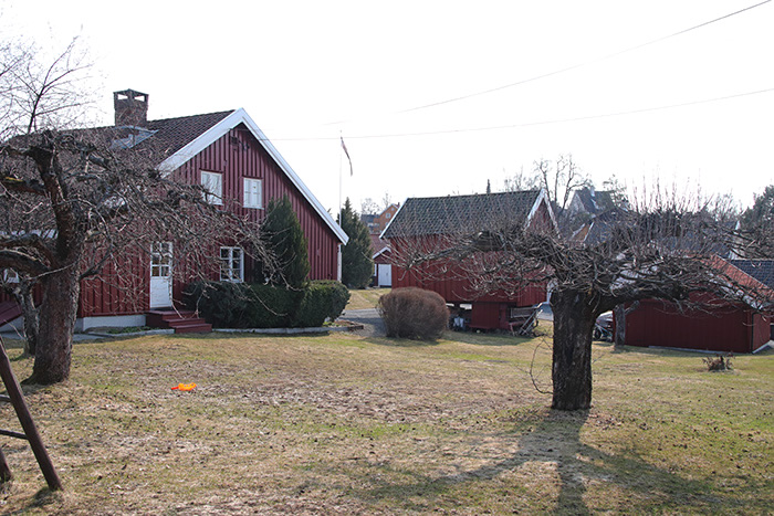 Jarveien ligger til venstre for gården, og vi ser det gule Jarhuset øverst ved enden av denne veien.