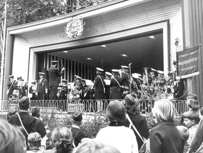 17. mai på Lysaker skole 2010, få dager etter brannen i nybygget. Lysaker skoles musikkorps spiller. Kilde: Lokalhistoriewiki