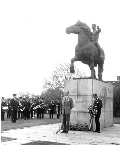 Over: Rytterstatuen ved rådhuset ble avduket 7. juni 1953 av Olaf Helset, en av motstandskampens fremste ledere.