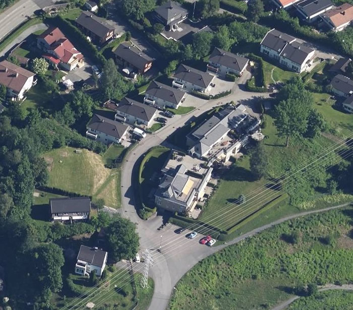 Midt i bildet, rett vest for Jongsbruveien 25, lå gravrøysen. Sett fra syd.