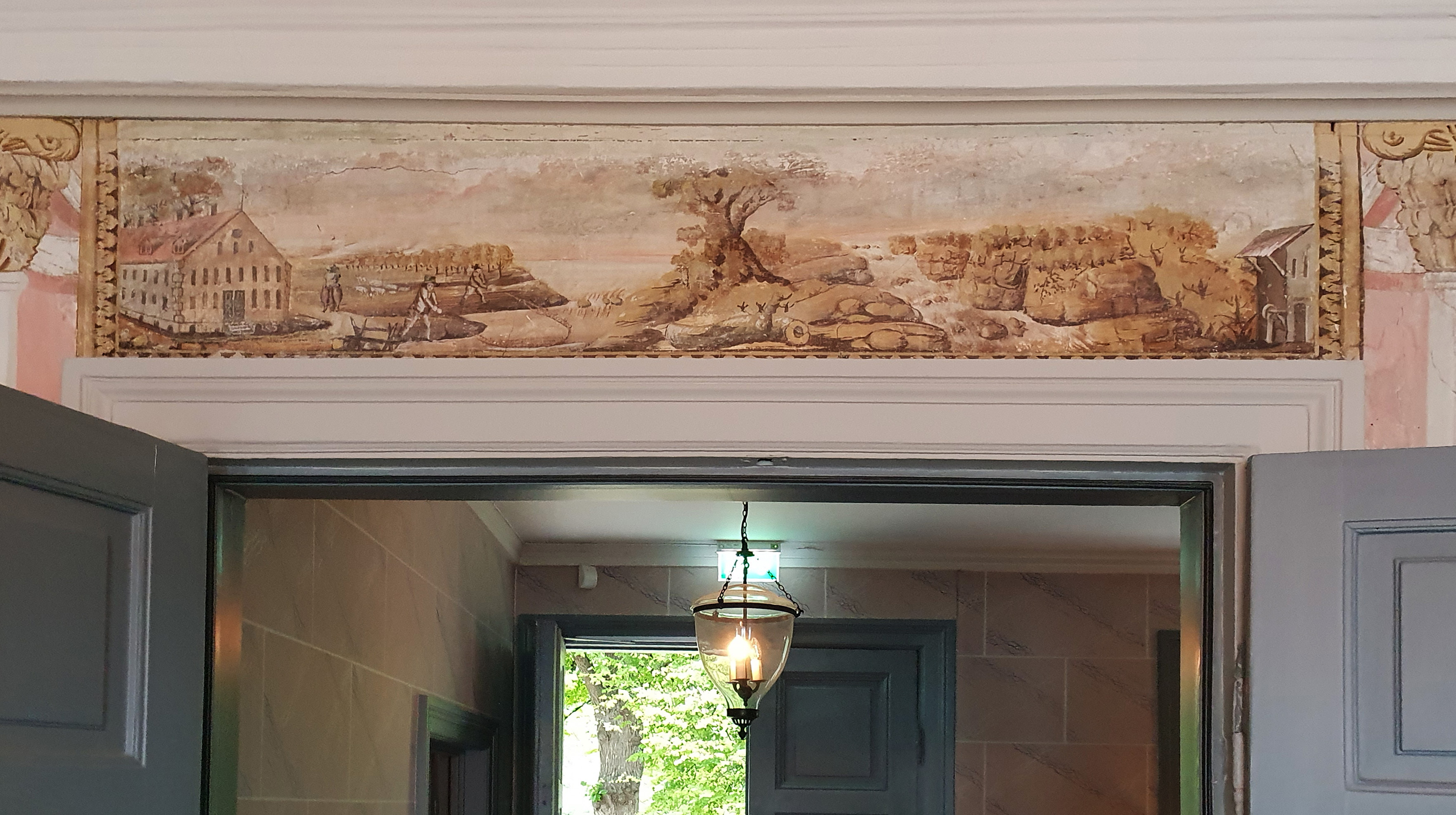 Her er en av salene, der man har fjernet gammel maling, og vi ser den opprinnelige fargen. Øverst på veggene er fine border kommet frem. Foto: Knut Erik Skarning