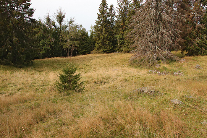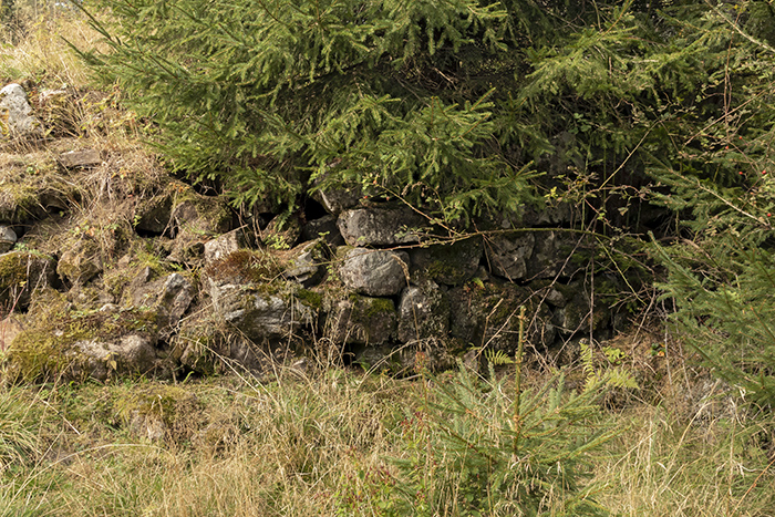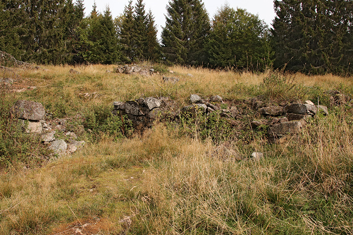 Rester (grunnmurer) etter fire hus og en del rydningsrøyser er fortsatt synlig.